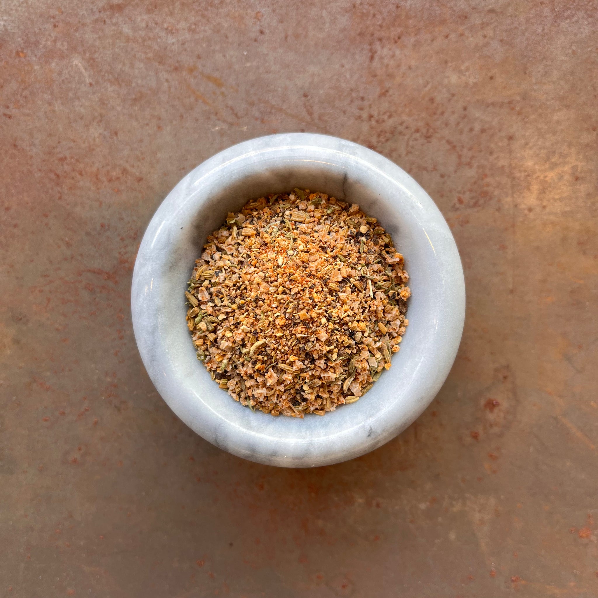 Ingredients: Fennel seed, black pepper, smoked paprika, granulated garlic, salt, thyme, and orange peel.